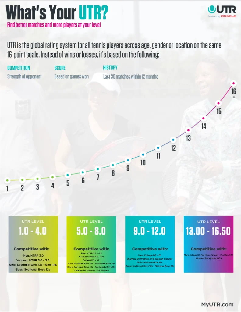 The Universal Tennis Rating (UTR, Powered by Oracle) is the global gold standard for all tennis players which reflects their current skill level based on actual performance. It is the world’s only purely results-based rating system in tennis, which rates all players on the same 16-point scale regardless of age, gender or location. UTR is widely used throughout the tennis community by professionals, collegiate players, juniors and recreational players. It is the only proven rating system that allows you to track your progress in real time.